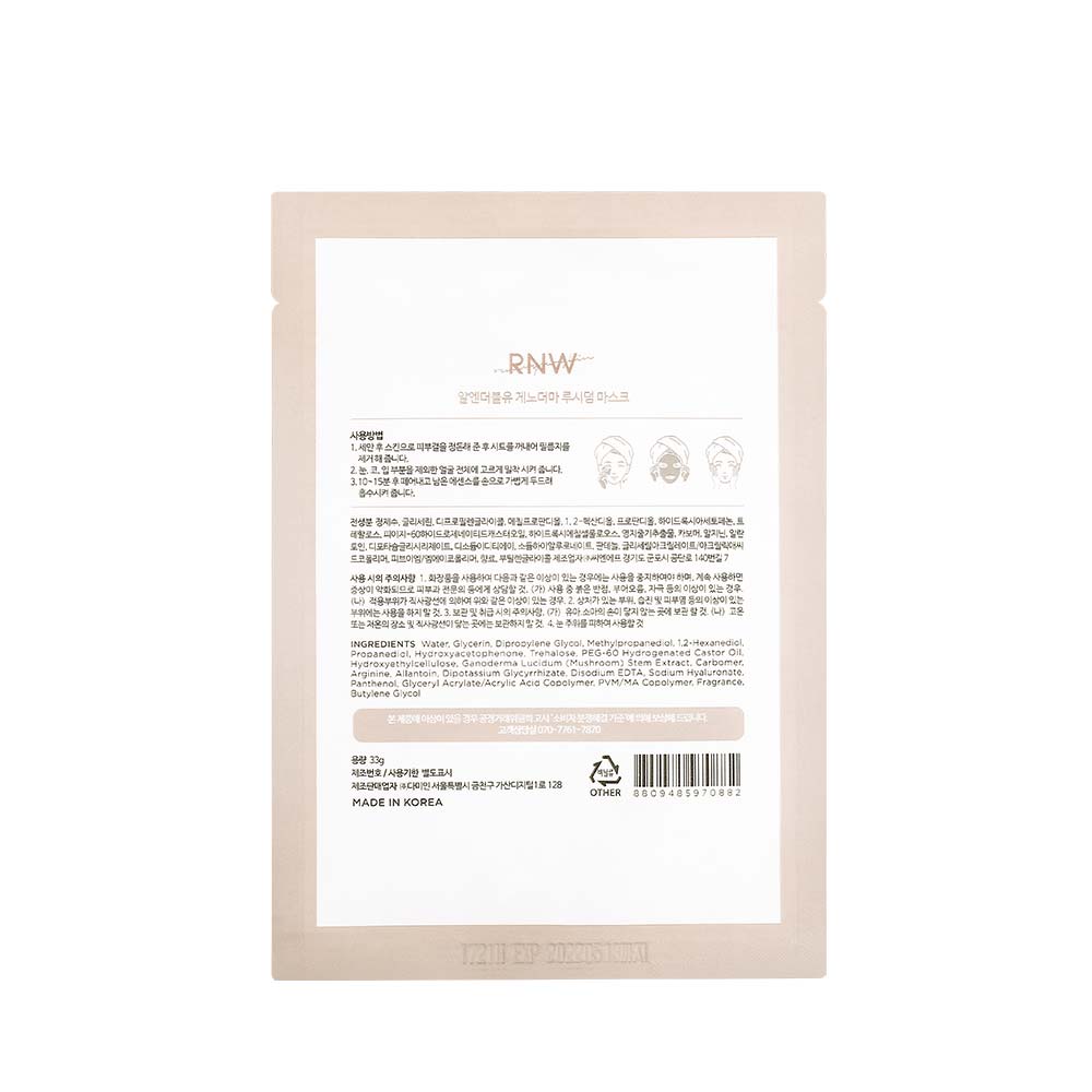 Η μάσκα λάμψης RNW Ganoderma Lucidum Mask με εκχύλισμα μανιταριού Ganoderma ενυδατώνει τέλεια το δέρμα και κάνει την επιδερμίδα υγιή και όμορφη, προσφέροντάς της χρήσιμες ουσίες. Η μάσκα θρέφει σε βάθος την επιδερμίδα, λειαίνει, εξαφανίζει τις λεπτές ρυτίδες και τις πτυχές και χαρίζει στο δέρμα λάμψη και φρεσκάδα. Η μάσκα περιέχει ένα μοναδικό συστατικό, το εκχύλισμα μανιταριού Ganoderma (Reishi), το οποίο έχει υψηλές ανοσοδιεγερτικές, αντιφλεγμονώδεις και αντιοξειδωτικές ιδιότητες. Το μανιτάρι Ganoderma είναι πλούσιο σε πολυσακχαρίτες, αμινοξέα, πεπτίδια, πρωτεΐνες, βιταμίνες και μικροστοιχεία, τα οποία είναι εξαιρετικά χρήσιμα για το δέρμα, αναζωογονεί την επιδερμίδα, αυξάνει τη σφριγηλότητα και την ελαστικότητα των ιστών και χαρίζει λάμψη για δέρμα λείο, απαλό και περιποιημένο.